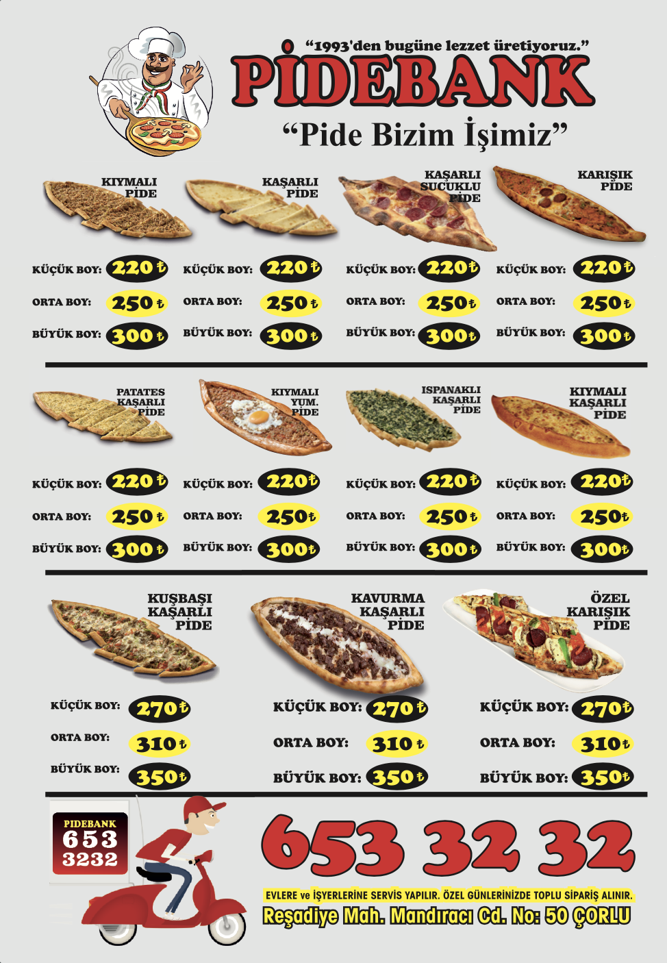 Pide Bank Çorlu, Çorlu'da hizmet veren bir yemek işletmesidir. İşletme, paket servis, gel-al hizmeti, restoranda yemek, öğle yemeği ve akşam yemeği hizmetleri sunmaktadır. Müşteriler, işletmenin lezzetli yemeklerini tadarak, günlük yaşamını kolaylaştırabilirler. İşletme, müşteri memnuniyetini göz önünde bulundurur ve müşteri memnuniyetini artırmaya devam eder.